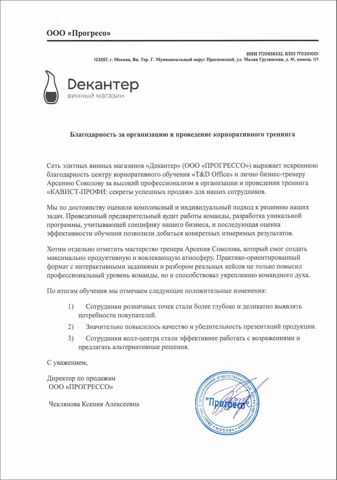 Сеть элитных винных магазинов "Декантер" выражает искреннюю благодарность центру корпоративного обучения "T&D Office" и лично бизнес-тренеру Арсению Соколову за высокий профессионализм в организации и проведении тренинга «КАВИСТ-ПРОФИ: секреты успешных продаж» для наших сотрудников.